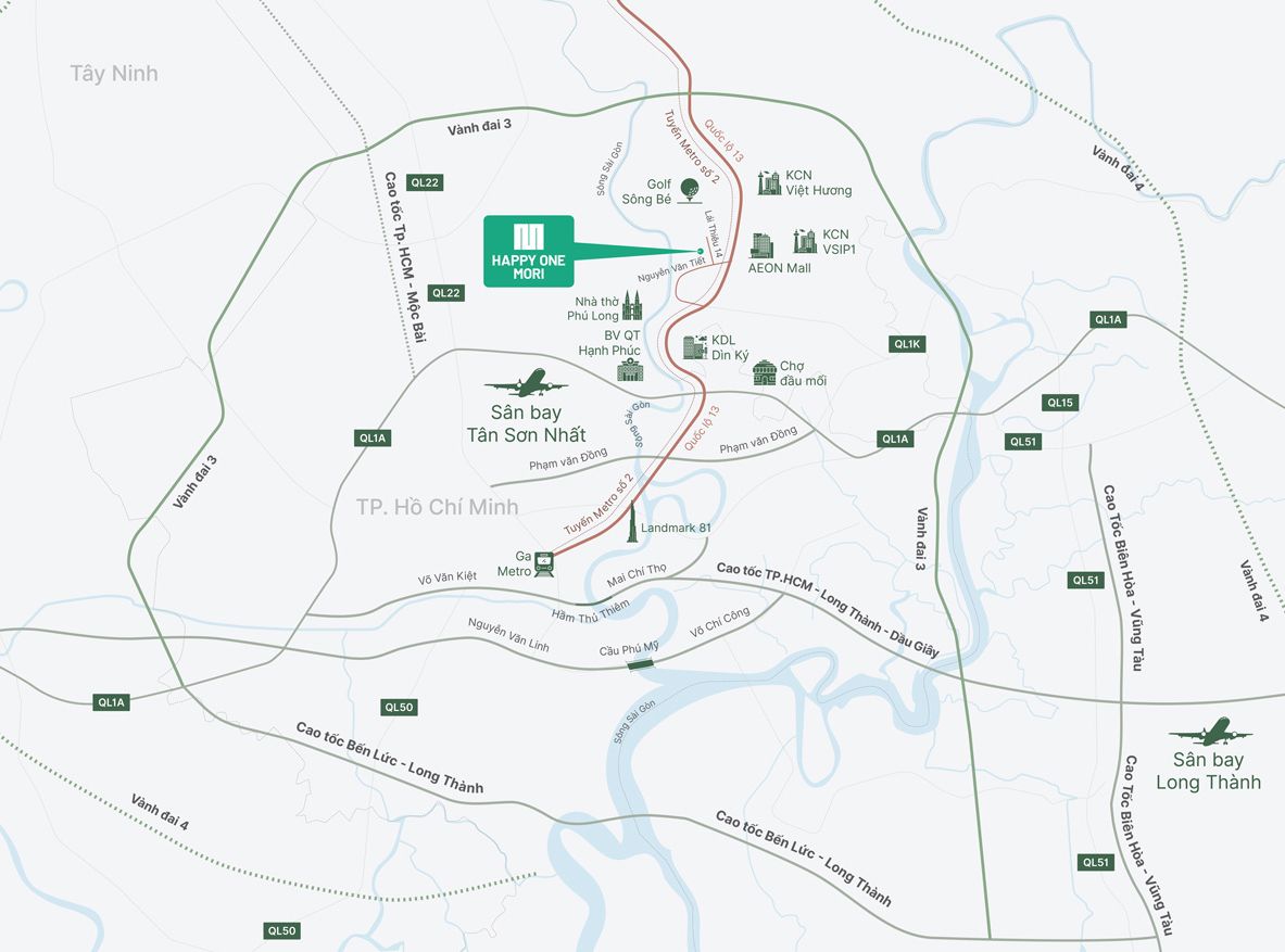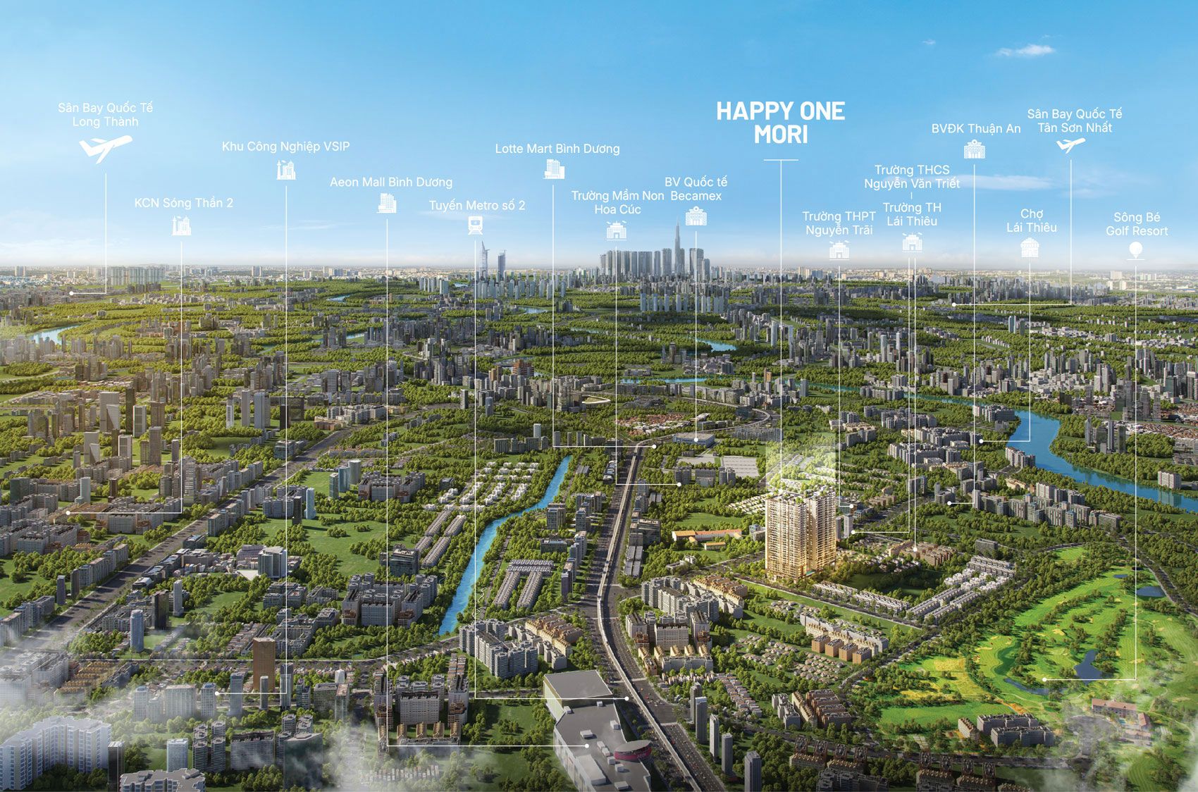 Happy One Mori không chỉ là một căn hộ, mà là tuyên ngôn về một phong cách sống resort đẳng cấp ngay tại cửa ngõ sầm uất phía Đông Bắc TP. HCM. Tọa lạc tại vị trí “Tam Giác Vàng” Thuận An – Dĩ An, dự án dễ dàng kết nối với Quốc lộ 13 và tuyến Metro số 2, mang lại tiềm năng gia tăng giá trị vượt trội cho nhà đầu tư F0.